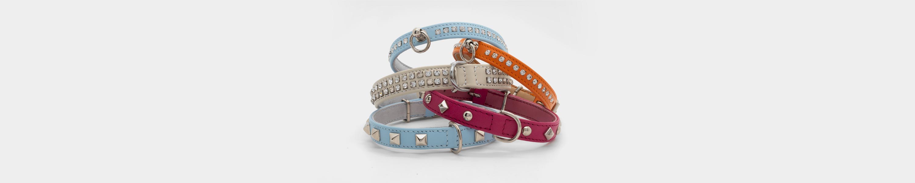 Collari, pettorine e guinzagli in vera pelle di altissima qualità, estremamente morbida e confortevole da indossare per il tuo cane. Collari decorati con strass, piccole borchie o semplicemente lisci. Guinzagli piatti o tubolari comodi da impugnare. Per cani di taglia piccola e media.